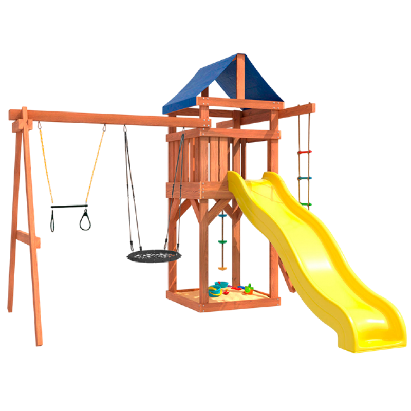 Детская площадка - отличное решение для активного отдыха детей на свежем воздухе. Она представляет собой многофункциональный игровой комплекс, который включает в себя горку, качели, песочницу, игровую веранду, веревочную лестницу, скалодром и канат. Все элементы выполнены из качественных и безопасных материалов, что обеспечивает долговечность и надежность конструкции.