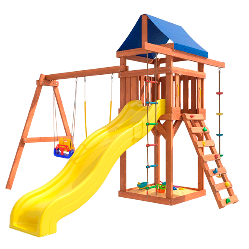 - Площадка изготавливается из лесоматериалов лиственных и хвойных пород. Материал имеет естественную древесную текстуру, обработан специальными составами для большего срока использования и предохранения от разрушения древесины. Все элементы проходят предварительную шлифовку, а края изделия закруглены. Небольшое количество металлических элементов значительно исключает возможность получения ребенком травм.