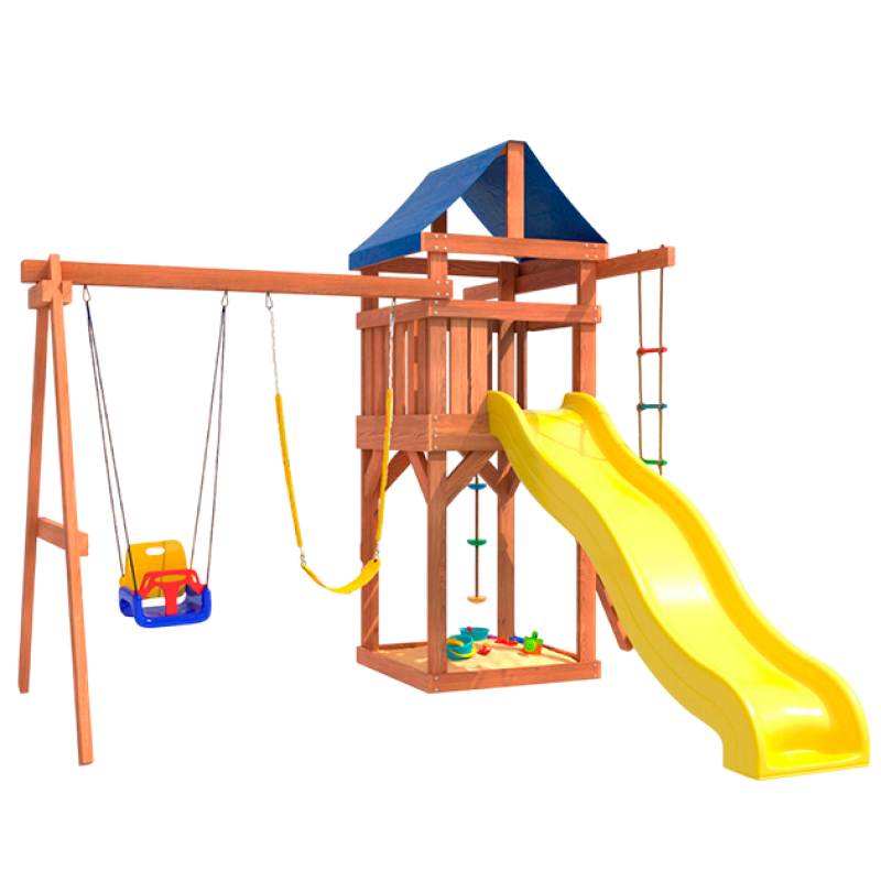 Детская площадка - это многофункциональный игровой комплекс, который включает в себя горку, качели, песочницу, игровую веранду, веревочную лестницу, скалодром и канат. Все элементы выполнены из качественных и безопасных материалов, что обеспечивает долговечность и надежность конструкции.