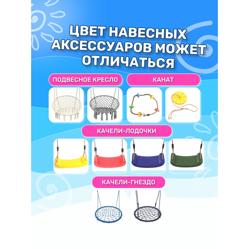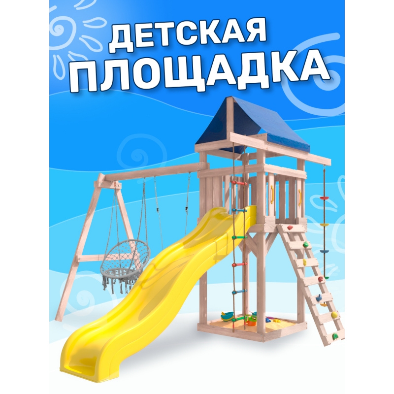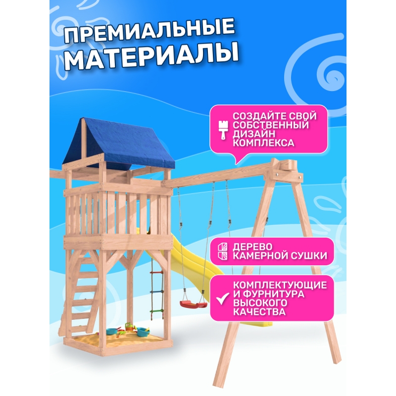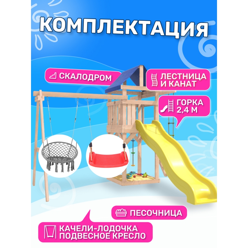 - Разнообразие игровых элементов — горка, качели, песочница, скалодром и другие для всестороннего развития ребенка.