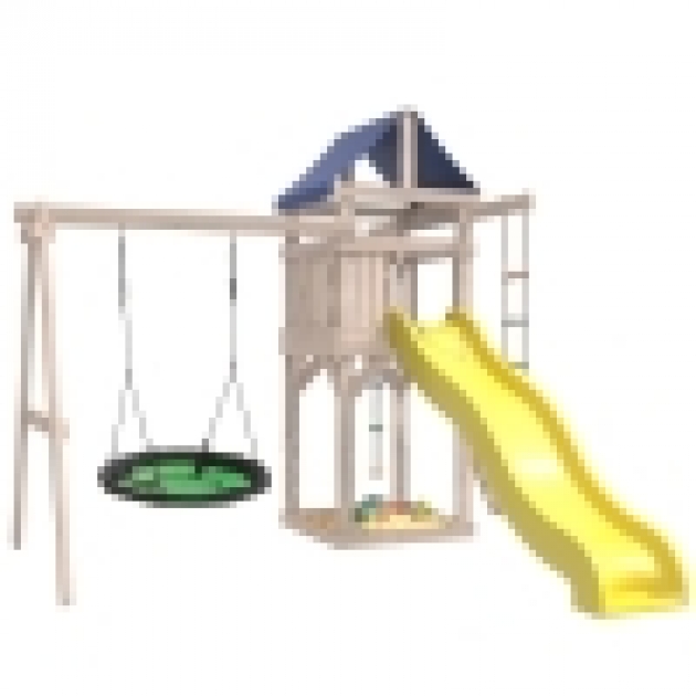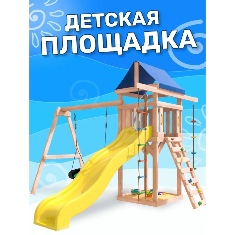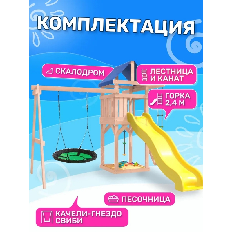 Многофункциональный игровой комплекс включает в себя разнообразные элементы: горку, качели, песочницу, игровую веранду, веревочную лестницу, скалодром и канат, что делает его привлекательным для детей от 3 до 14 лет.