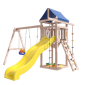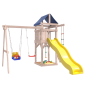 Многофункциональный игровой комплекс включает в себя разнообразные элементы: горку, качели, песочницу, игровую веранду, веревочную лестницу, скалодром и канат, что делает его привлекательным для детей от 3 до 14 лет.