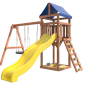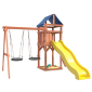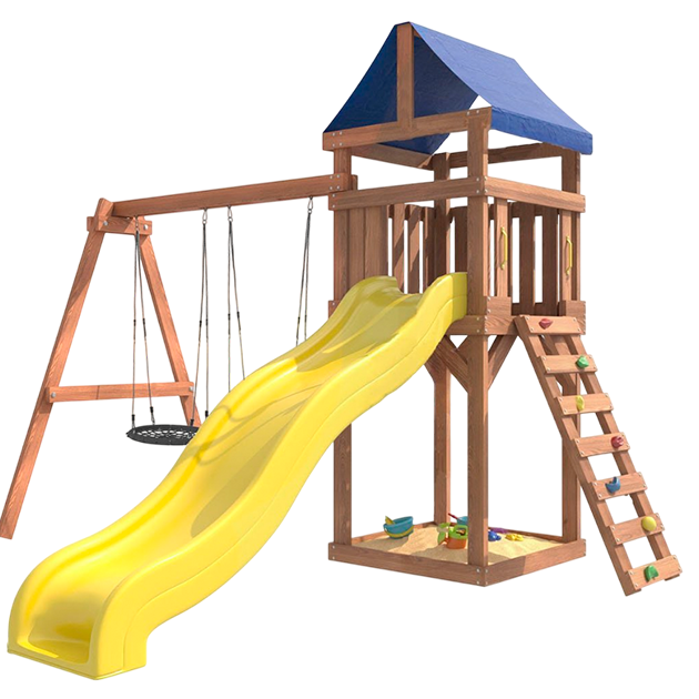 Площадка изготавливается из лесоматериалов лиственных и хвойных пород. Материал имеет естественную древесную текстуру, обработан специальными составами для большего срока использования и предохранения от разрушения древесины. Все элементы проходят предварительную шлифовку, а края изделия закруглены. Небольшое количество металлических элементов значительно исключает возможность получения ребенком травм.