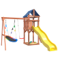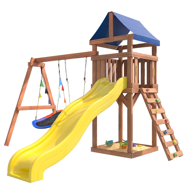 Площадка изготавливается из лесоматериалов лиственных и хвойных пород. Материал имеет естественную древесную текстуру, обработан специальными составами для большего срока использования и предохранения от разрушения древесины. Все элементы проходят предварительную шлифовку, а края изделия закруглены. Небольшое количество металлических элементов значительно исключает возможность получения ребенком травм.