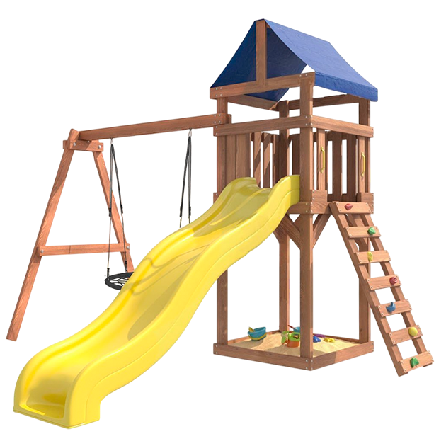 Площадка изготавливается из лесоматериалов лиственных и хвойных пород. Материал имеет естественную древесную текстуру, обработан специальными составами для большего срока использования и предохранения от разрушения древесины. Все элементы проходят предварительную шлифовку, а края изделия закруглены. Небольшое количество металлических элементов значительно исключает возможность получения ребенком травм.