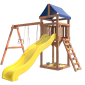 Площадка изготавливается из лесоматериалов лиственных и хвойных пород. Материал имеет естественную древесную текстуру, обработан специальными составами для большего срока использования и предохранения от разрушения древесины. Все элементы проходят предварительную шлифовку, а края изделия закруглены. Небольшое количество металлических элементов значительно исключает возможность получения ребенком травм.