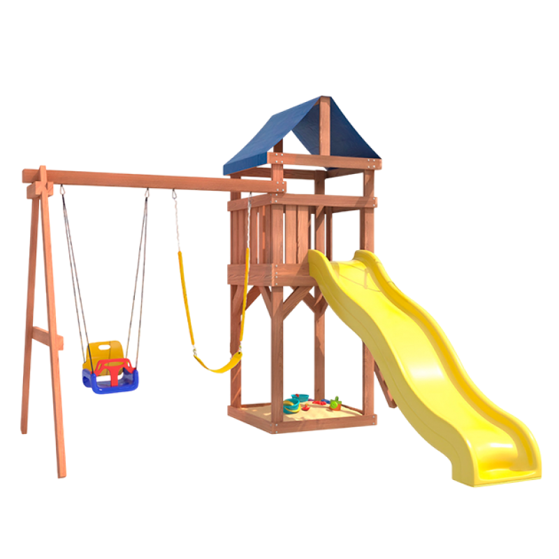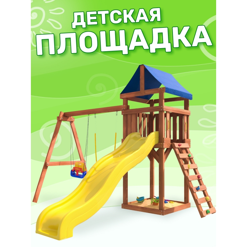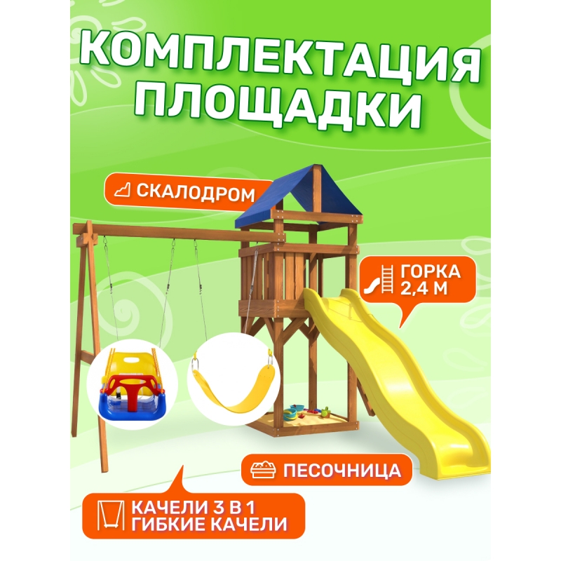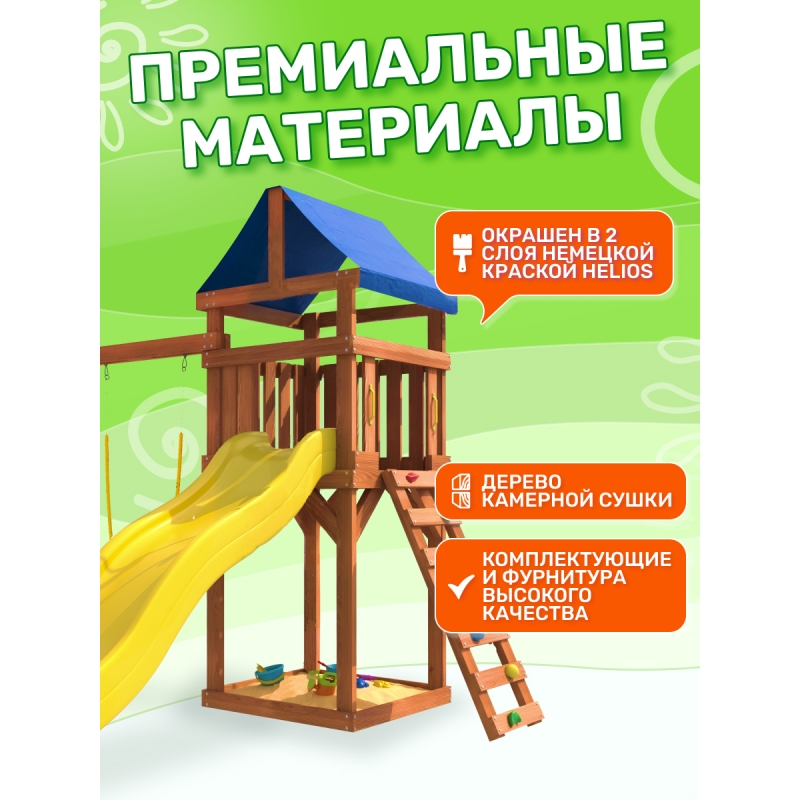 Площадка изготавливается из лесоматериалов лиственных и хвойных пород. Материал имеет естественную древесную текстуру, обработан специальными составами для большего срока использования и предохранения от разрушения древесины. Все элементы проходят предварительную шлифовку, а края изделия закруглены. Небольшое количество металлических элементов значительно исключает возможность получения ребенком травм.